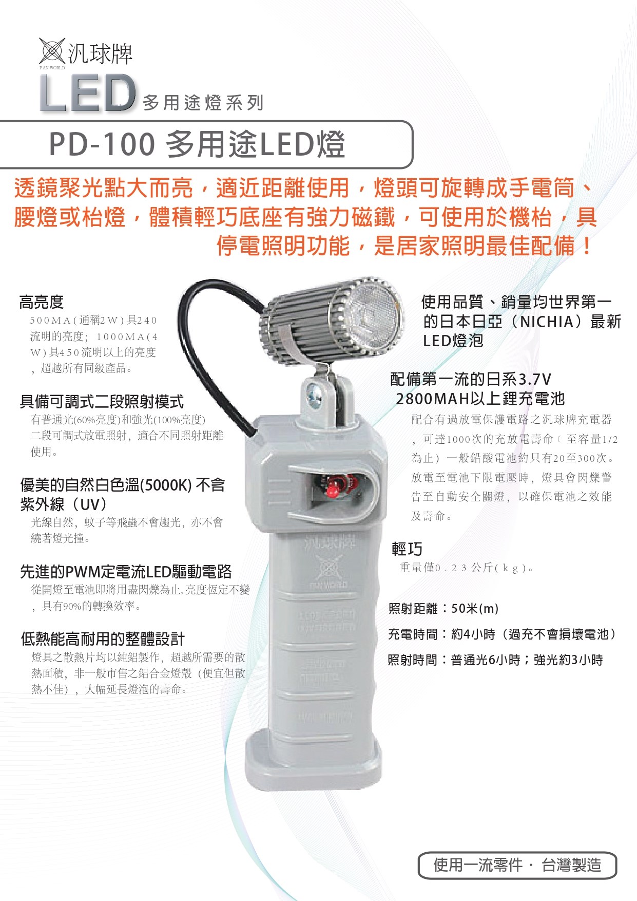 汎球行從事燈具的設計製作已有30年歷史,為提供專業燈具使用者持久耐用的照明設備,仍持續的研發出各種性能卓越的產品。使用品質、銷量均世界第一的日本日亞(NICHIA)最新LED燈泡,配備高品質的日系鋰電池,與日立(CSB)免保養電池,以及汎球行研發之原廠鋰電池充電適配器(ADAPTER)及LED燈具定電流驅動電路,耐用持久,有效保護電池及LED燈泡壽命。